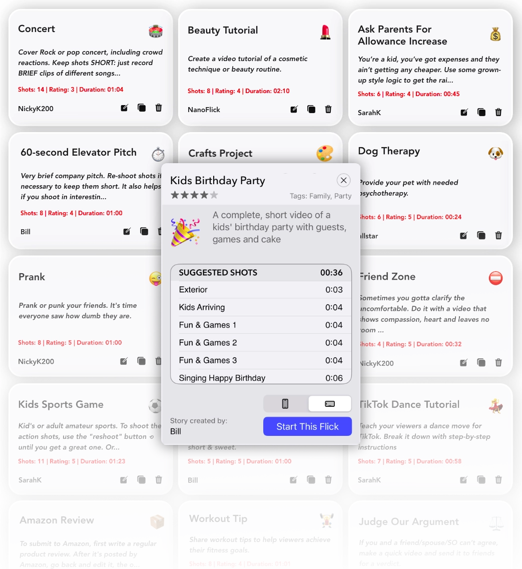 No one likes your long movies. Even your mom. NanoFlick provides guidance and guardrails to keep your flicks moving, touching, fun with a satisfying story structure.